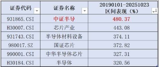 数据显示,中证半导从2019年至2025年10月23日区间涨幅高达480.37%,在主流半导体指数中位居第一。