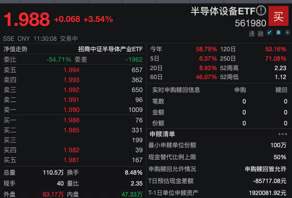 半导体设备ETF(561980)跟踪中证半导,标的指数中“半导体设备+材料”含量约70%,前十大重仓中微公司、北方华创、寒武纪-U、中芯国际、海光信息、长川科技等头部设备、材料、集成电路设计与制造厂商,聚焦“卡脖子”攻坚领域。